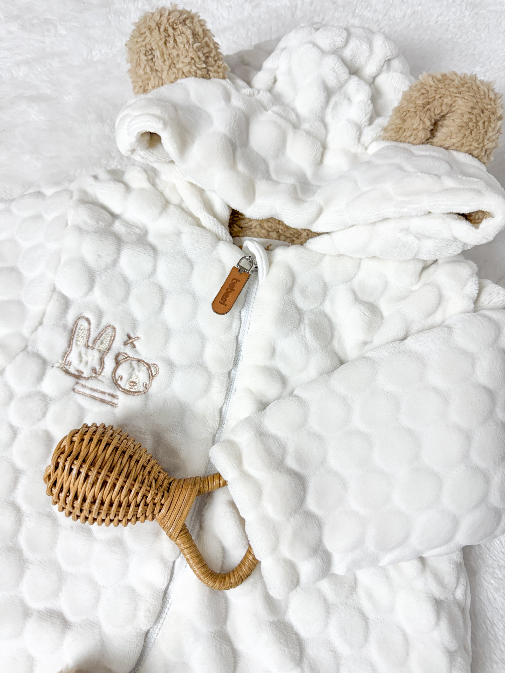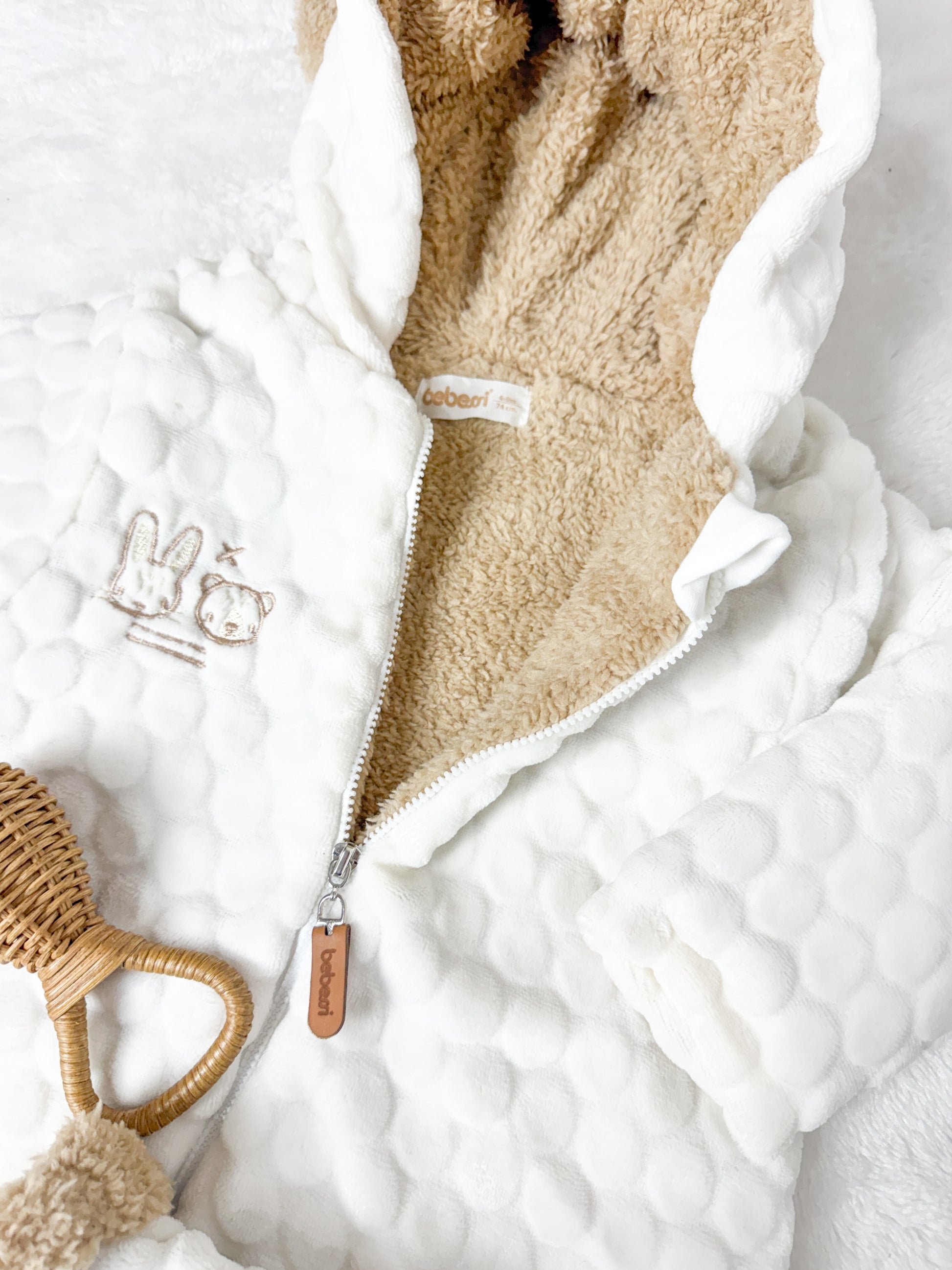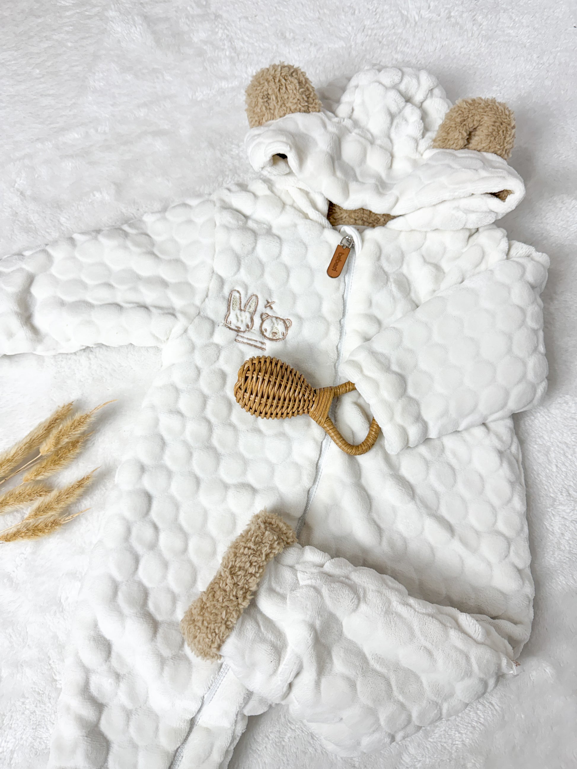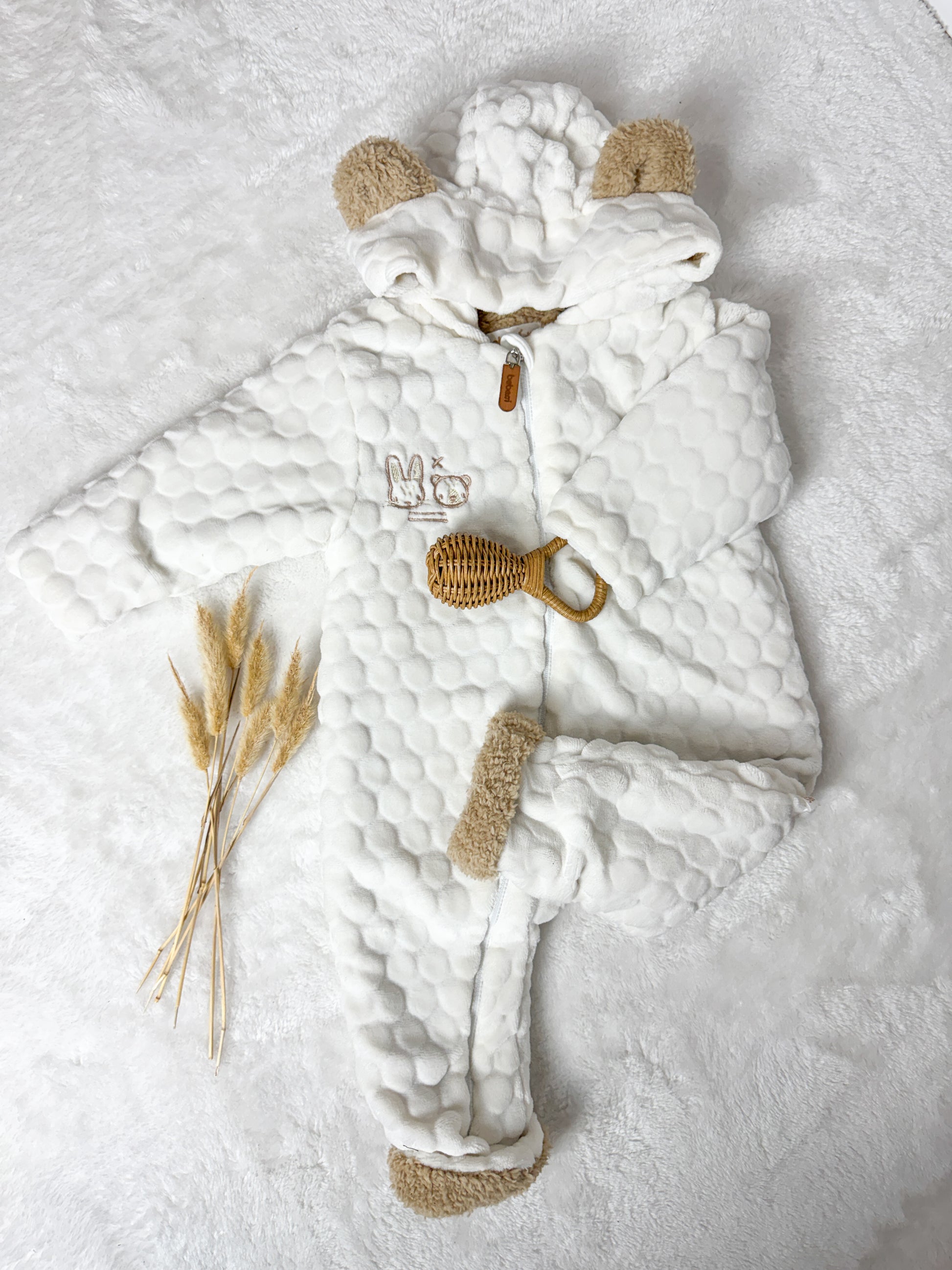 Dışı kabartmalı pamuksu dokusu, içi ise sıcacık peluş yapısıyla bebeğinizin gün boyu konforunu destekler.